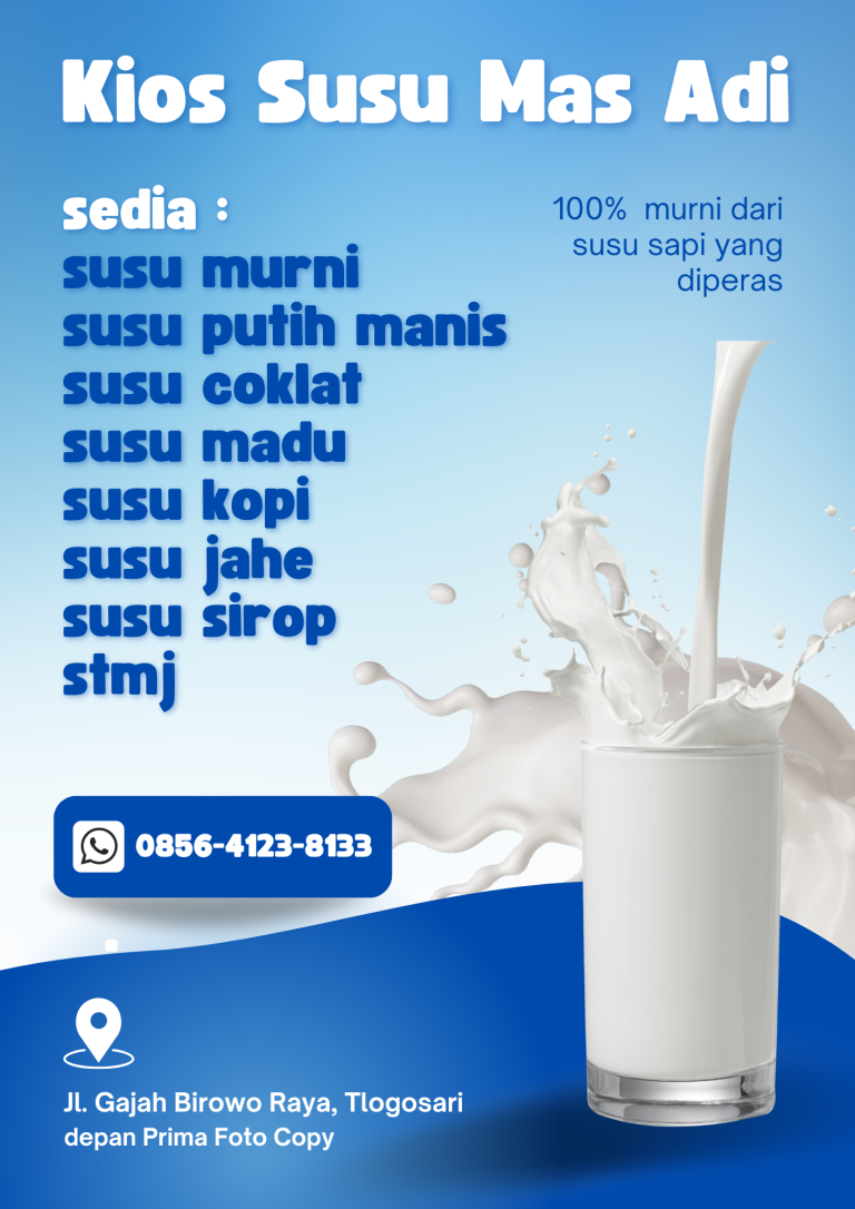 Ayo, jaga kesehatan tubuh Anda dengan Susu Murni dari Kios Susu Murni Mas Adi!  Segera kunjungi kios kami di depan kios Prima foto copy, Jl Gajah Birowo Raya dan rasakan kesegaran susu asli yang kaya manfaat!